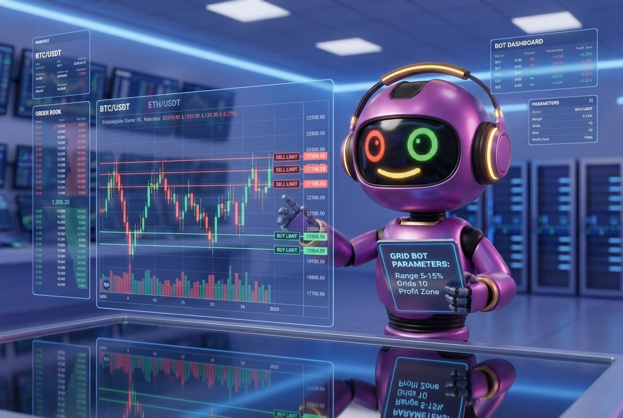 Настройка grid-бота в боковике — это настройка диапазона, шага и плотности сетки под конкретный канал. Сначала определяют нижнюю и верхнюю границы, внутри которых рынок уже несколько раз работал. Затем выбирают шаг между уровнями: он не должен быть слишком мелким, иначе прибыль будет съедаться комиссиями, и не должен быть слишком широким, иначе бот станет собирать слишком мало движений.